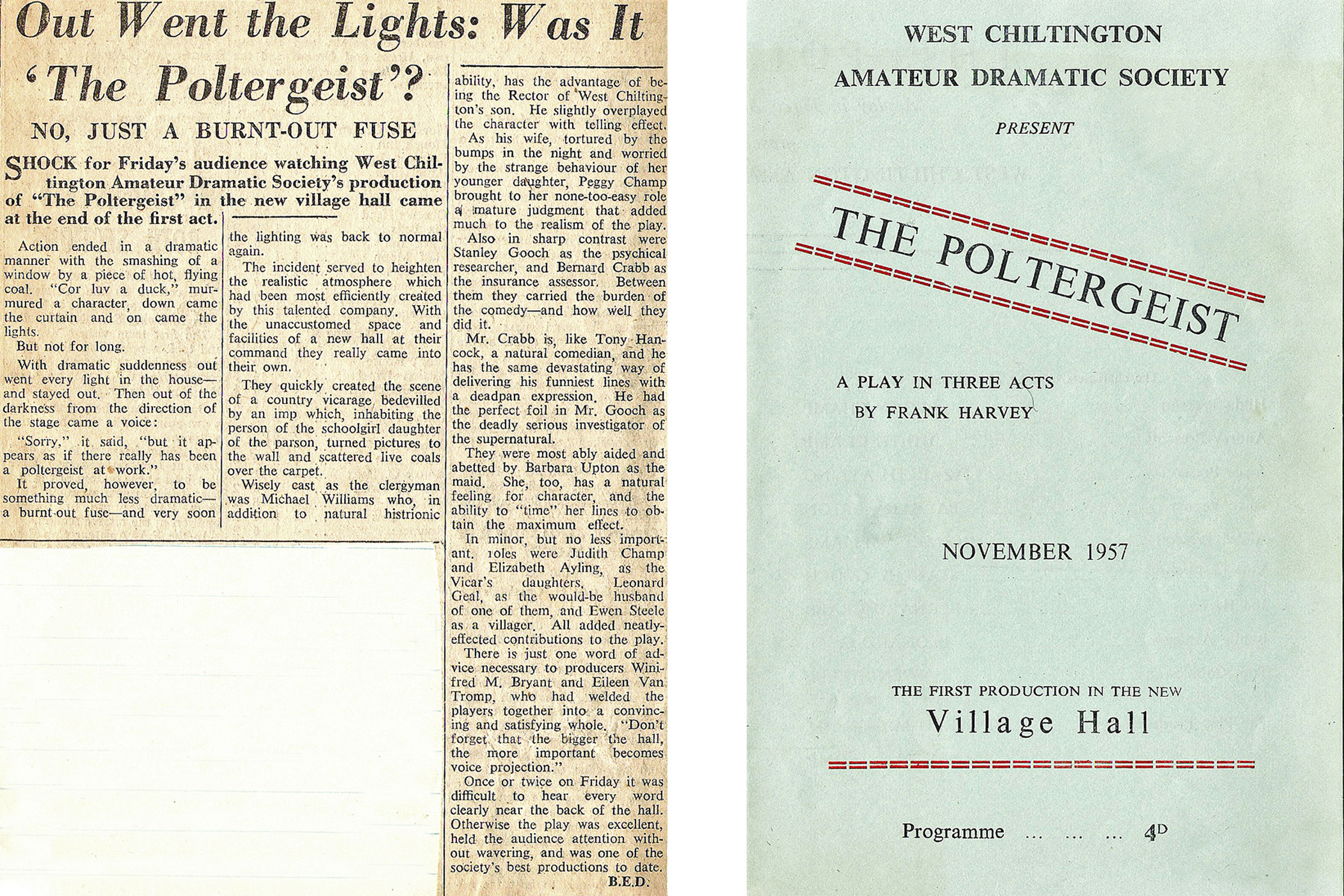 The Poltergeist concerns the strange activities of a mysterious spirit in a country vicarage. This was the first production to be performed in the new West Chiltington Village Hall. The drama was increased for the Friday night audience when the curtain came down on the first act and the house lights went up ....and then out again! Luckily it was only a blown fuse and the rest of the evening continued as normal.